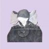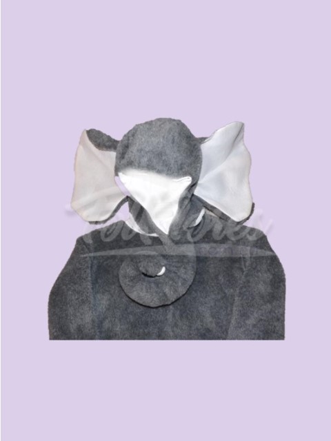 Disfraz con cremallera al frente, gorro separado del enterizo. Fabricado en tela especial para disfraces de animales, es un textil de pelo corto sintético, peludo de un tacto muy agradable y fino tipo imitación, de color gris con motas y con con cuerpo.