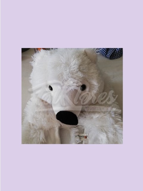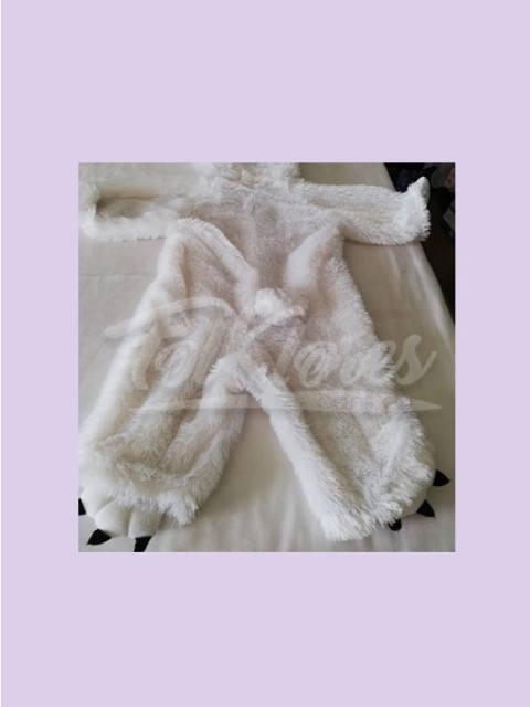 Disfraz con cremallera al frente, gorro unido al enterizo, fabricado en tela especial para disfraces de animales tipo imitación, de pelo corto sintético, peludo, generador de calor, de un tacto suave, de color blanco.
