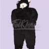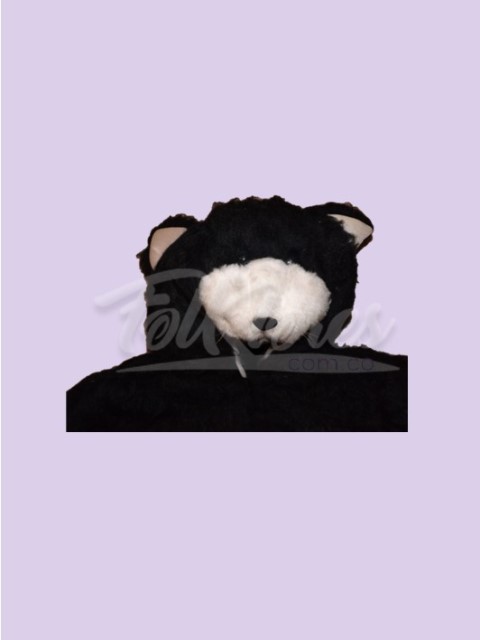 Disfraz con cremallera al frente, gorro unido al enterizo y está fabricado en tela especial para disfraces de animales, es un textil de pelo corto sintético, peludo, generador de calor, de un tacto rústico tipo imitación, de color negro con motas, con cuerpo y totalmente opaco.